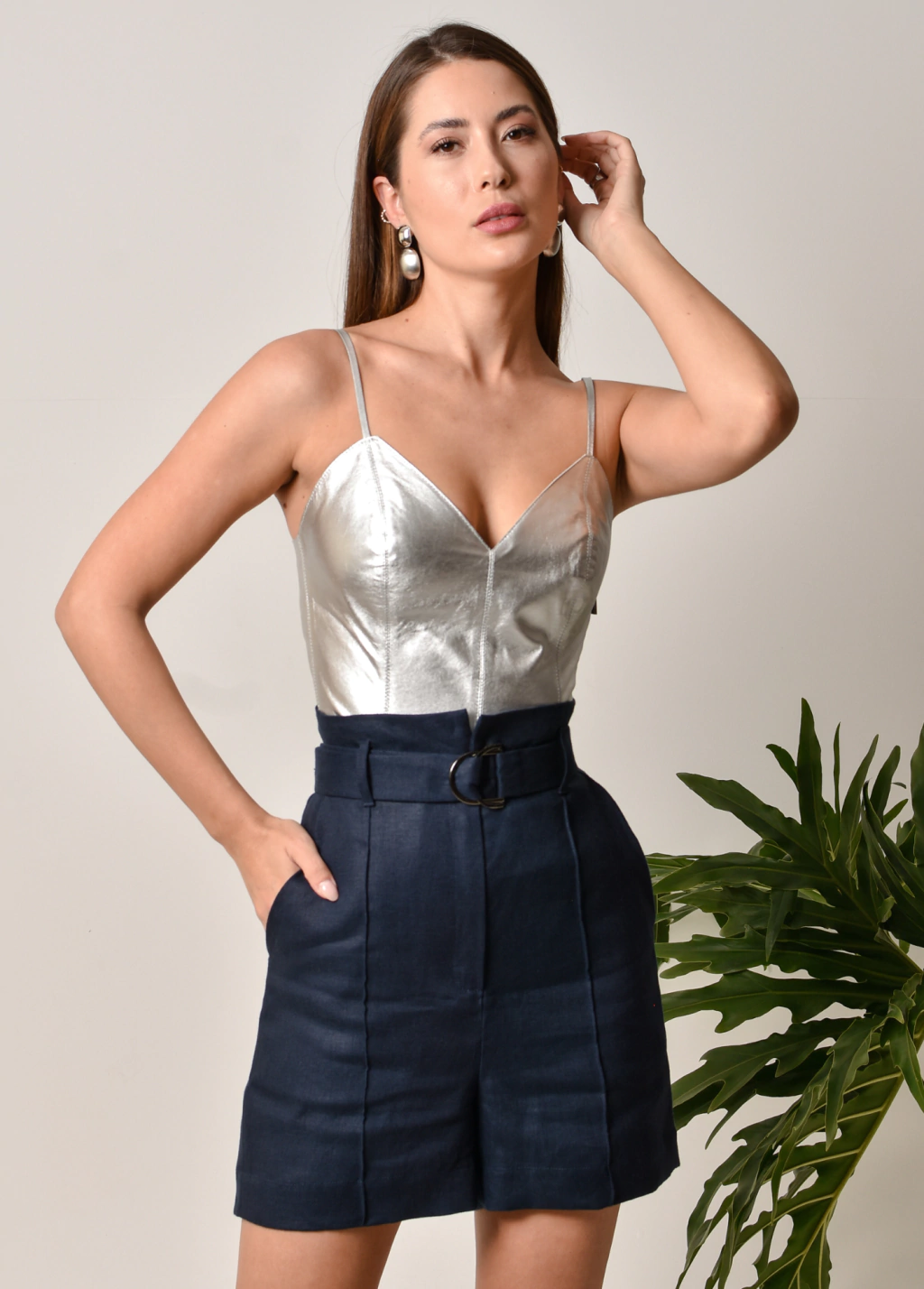 Bermuda com cintura alta e detalhe no cós, acompanha cinto com fivela metálica para o acabamento perfeito do look.