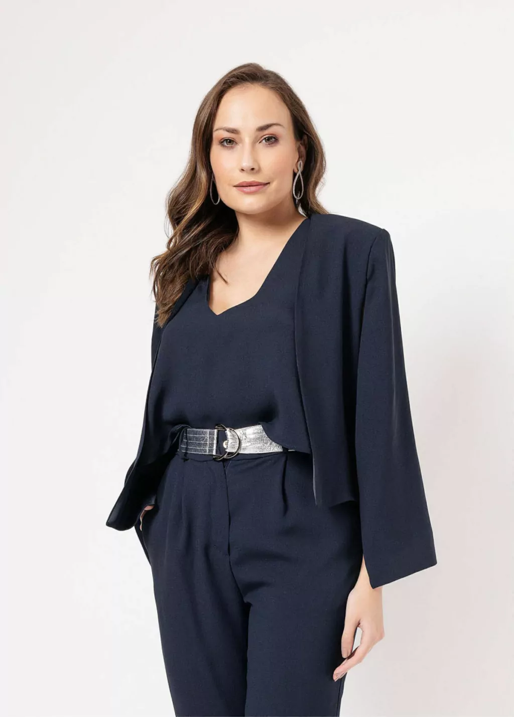 Ele forma um terno moderno com a Calça Dixie. E com o Top Cropped Izzy (todos no mesmo crepe), fica um conjunto muitíssimo elegante.