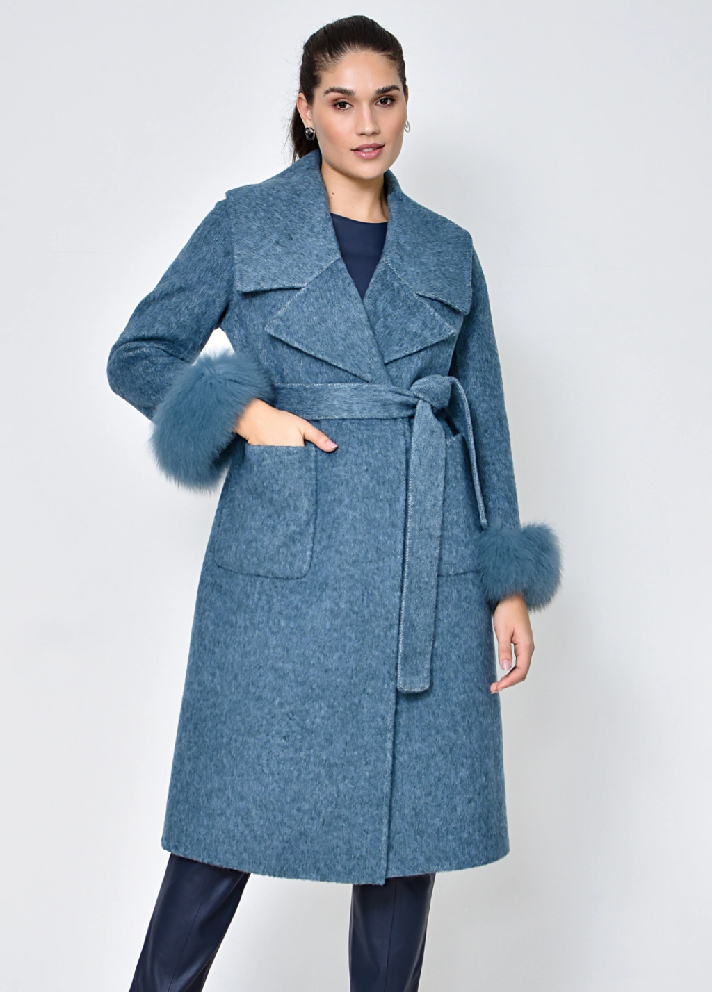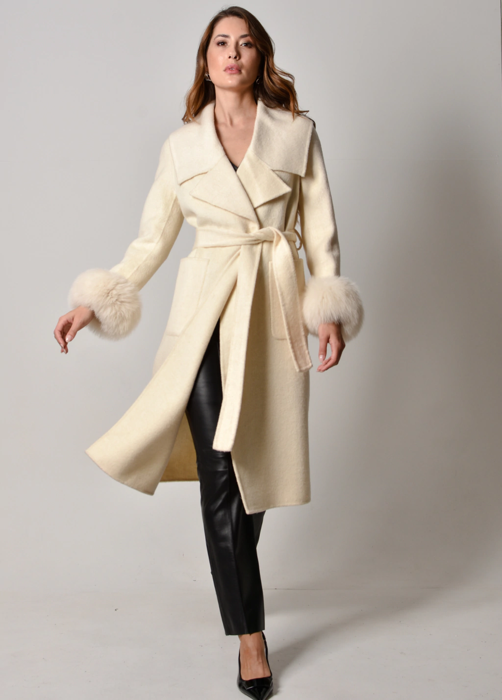Em cashmere e lã, possui punhos com pele de raposa removível. Faixa acompanha o casaco, que possui bolsos e lapela de destaque.