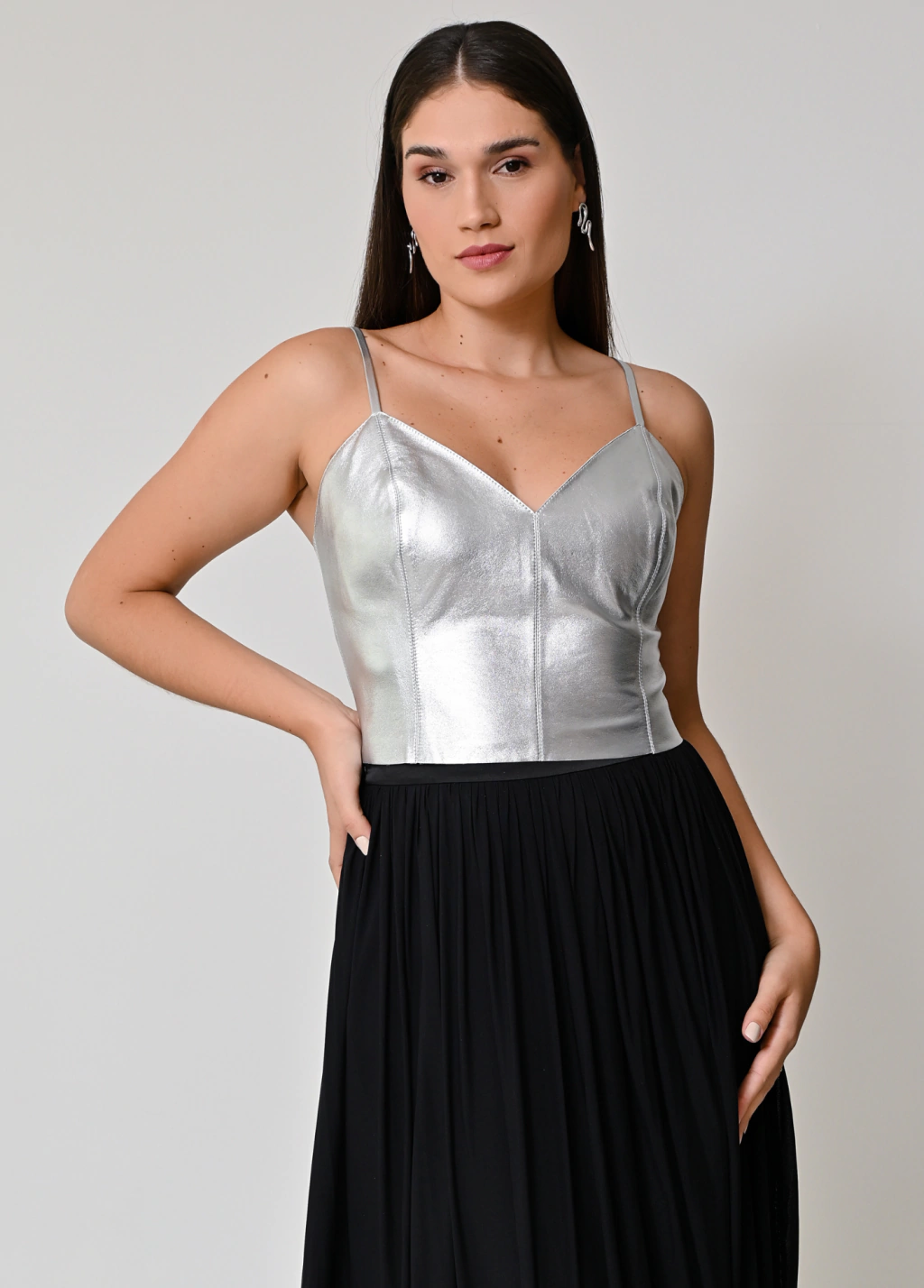 Possui regulagem nas alças (que são bem finas) e nas costas possui lastex produzido com o couro, para que a blusa se ajuste melhor ao corpo.