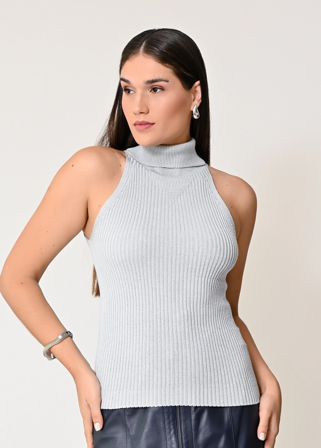 Blusa em malha ajustada ao corpo.
