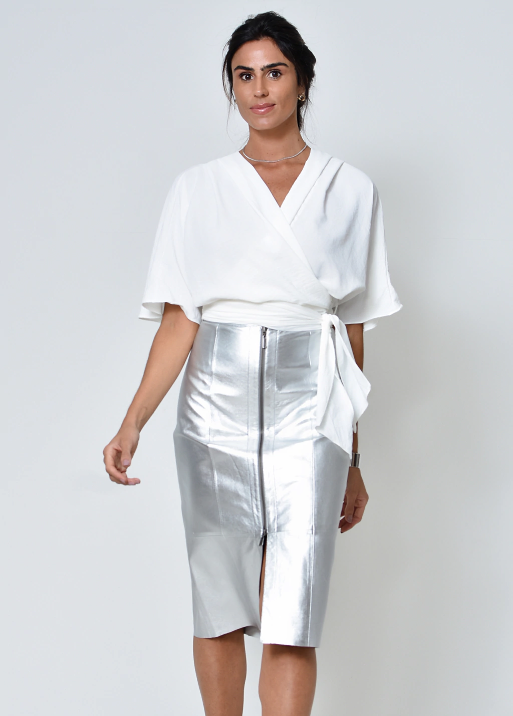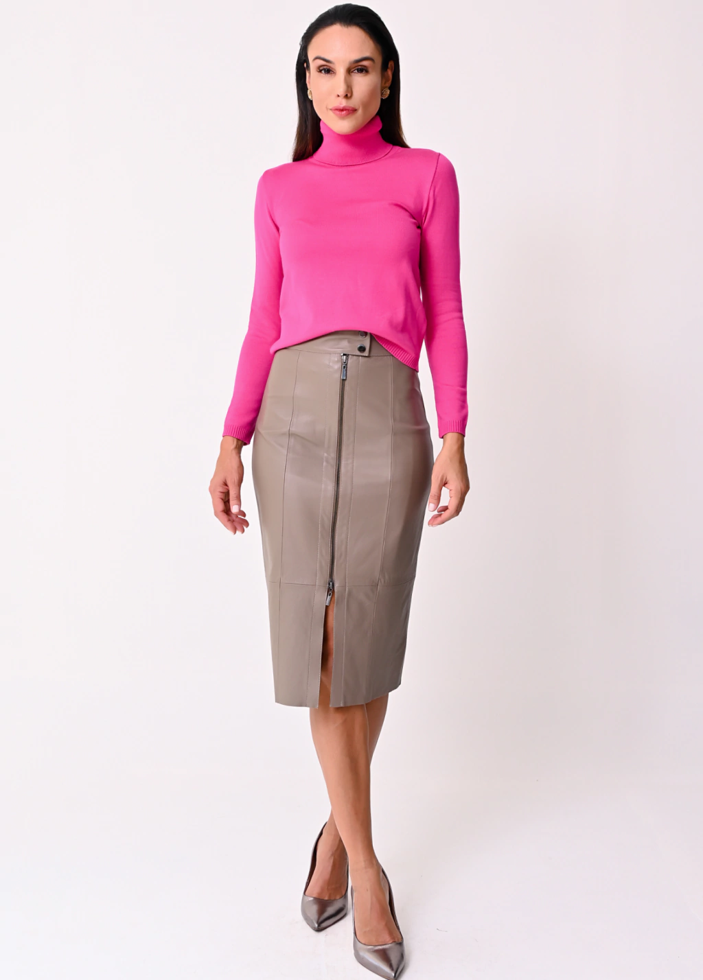 Elegante, minimalista, chique. Muitos atributos que a Saia Couro Georgia oferece.