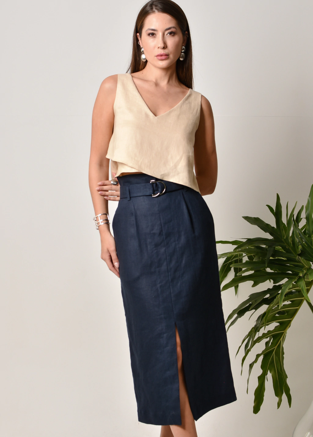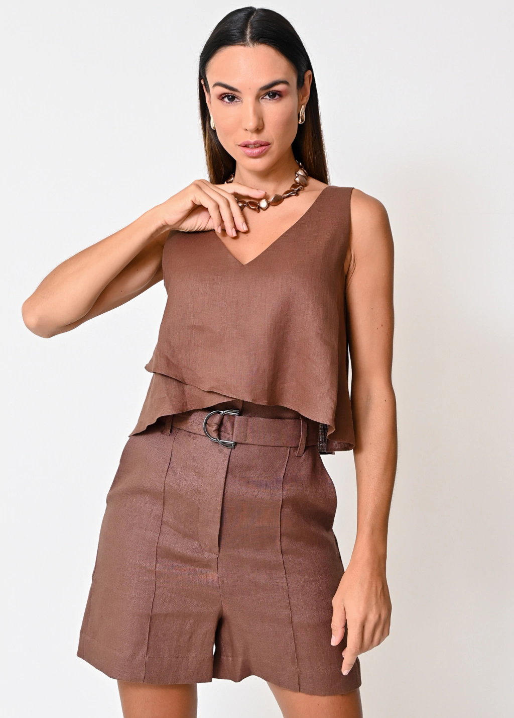 Comprimento ideal para usar com peças de cintura alta, como a saia, a bermuda e a calça da Coleção Linho.